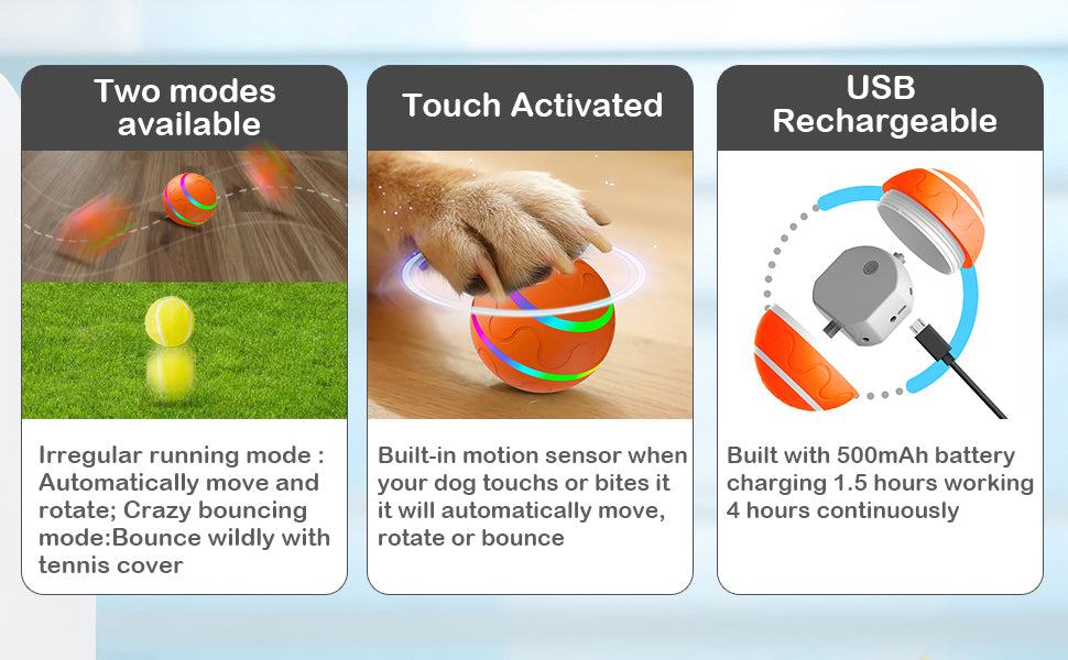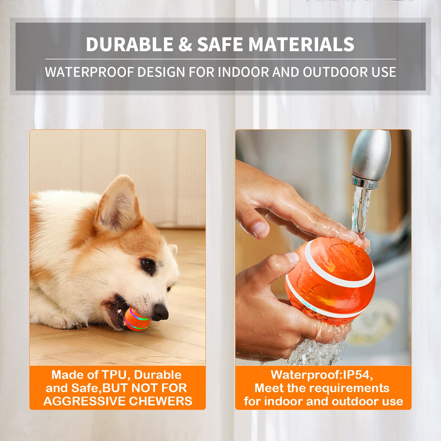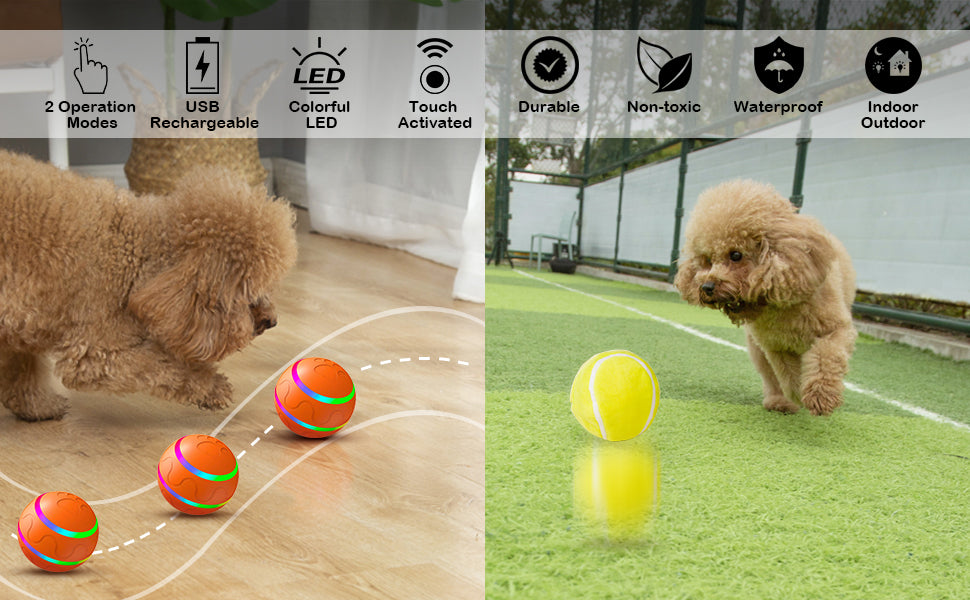 - 【Two modes available】Irregular Running Mode :Press and hold the button for 3 seconds, it will automatically move and rotate; Crazy Bouncing Mode: Press and hold the button for 3 seconds,then quickly press the button again, it will bounce automatically. Built-in multi-colors flash lights inside the ball, it can attract more attention and brings more joy to your dogs