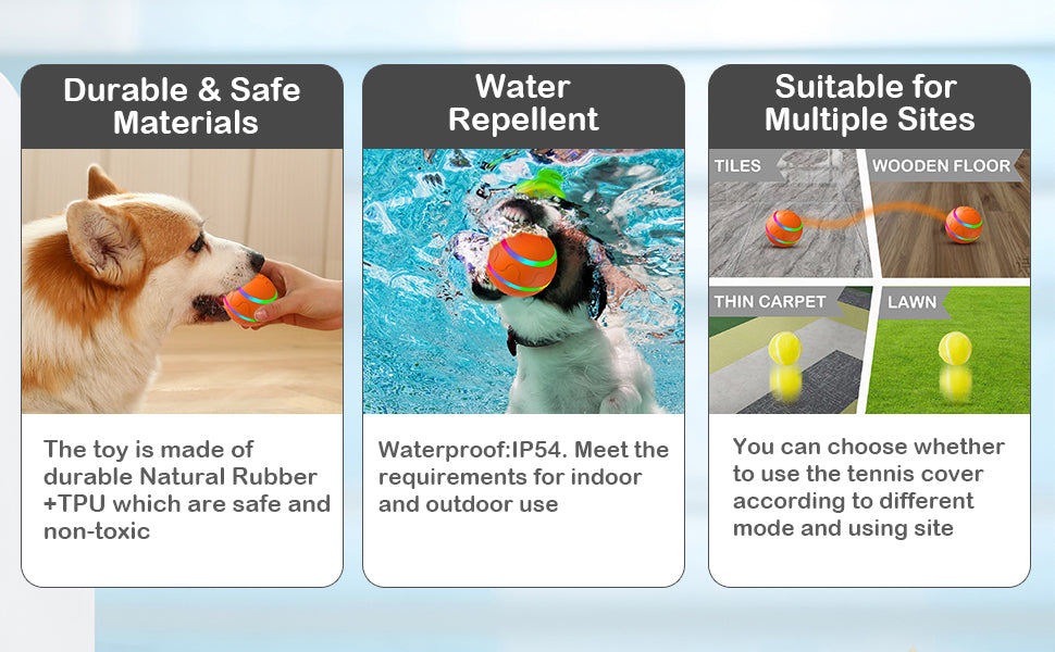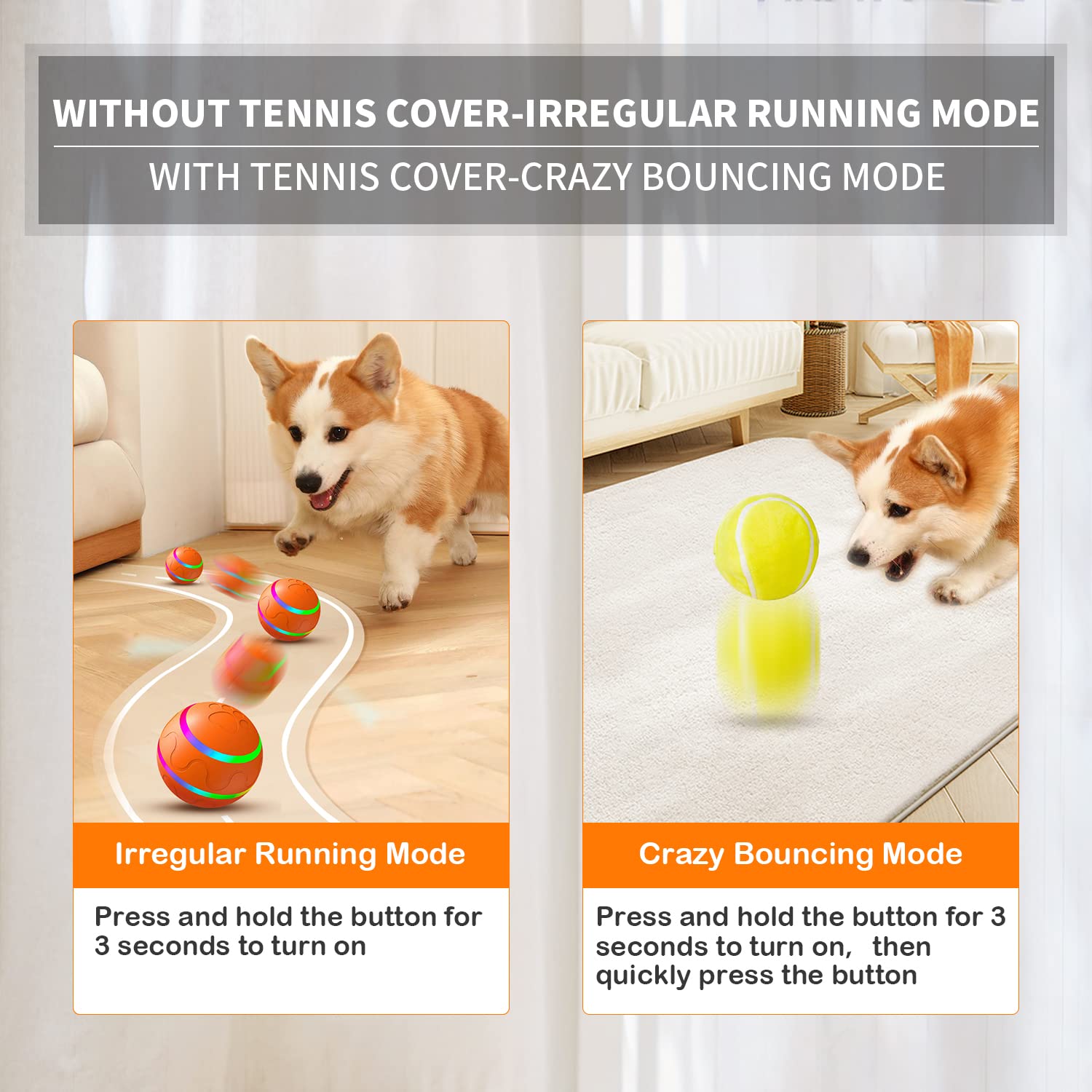 - 【Suitable for multiple sites】Irregular running mode doesn’t work with the tennis cover,for hard floors only,and not for chewers. The tennis cover could only work under crazy bouncing mode,special for slight chewers,better work on thin carpet or a lawn outdoor for lower noise